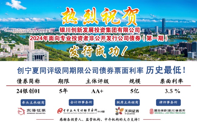 8月30日,銀川創(chuàng)新發(fā)展投資集團(tuán)有限公司2024年第一期面向?qū)I(yè)投資者非公開發(fā)行公司債券成功發(fā)行。本期債券發(fā)行規(guī)模5億元,期限:5年,票面利率:3.5%,創(chuàng)寧夏區(qū)域內(nèi)5年期私募債發(fā)行利率歷史最低。本期債券的成功發(fā)行,充分體現(xiàn)了資本市場(chǎng)對(duì)銀川市和創(chuàng)投集團(tuán)的認(rèn)可,降低了集團(tuán)融資成本,為集團(tuán)公司后續(xù)服務(wù)銀川市產(chǎn)業(yè)發(fā)展奠定了良好基礎(chǔ)。